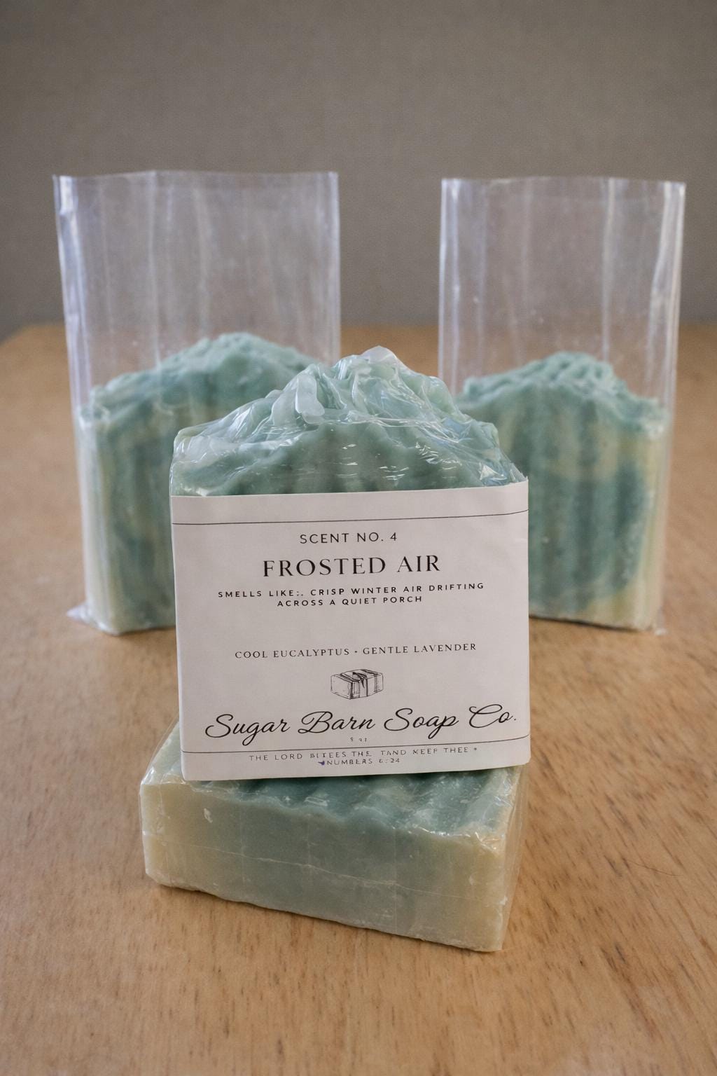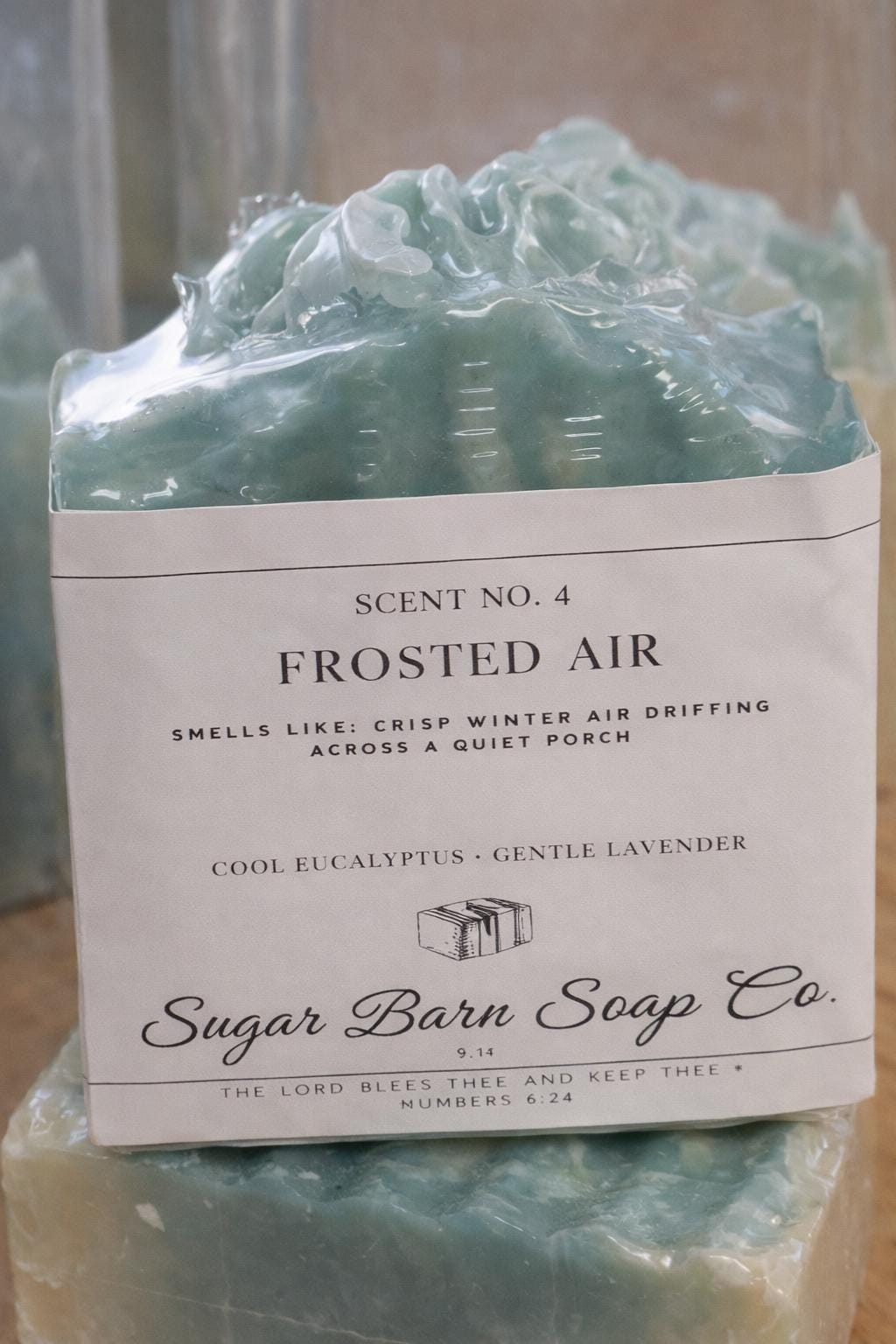 Frosted Air is a handcrafted bar soap inspired by crisp winter air drifting across a quiet screen porch — the kind of fresh that feels peaceful, not sharp. Cool eucalyptus is softened with gentle lavender to create a scent that is clean, airy, and balanced.