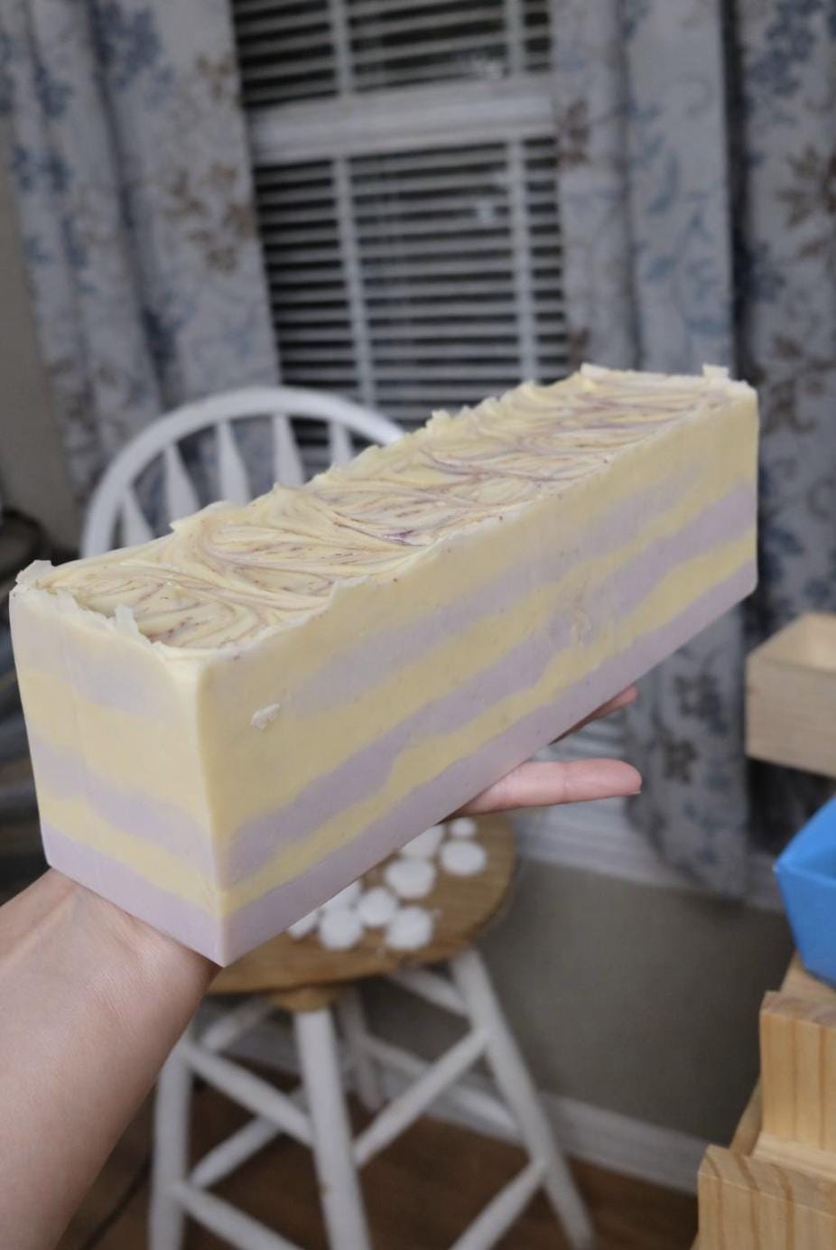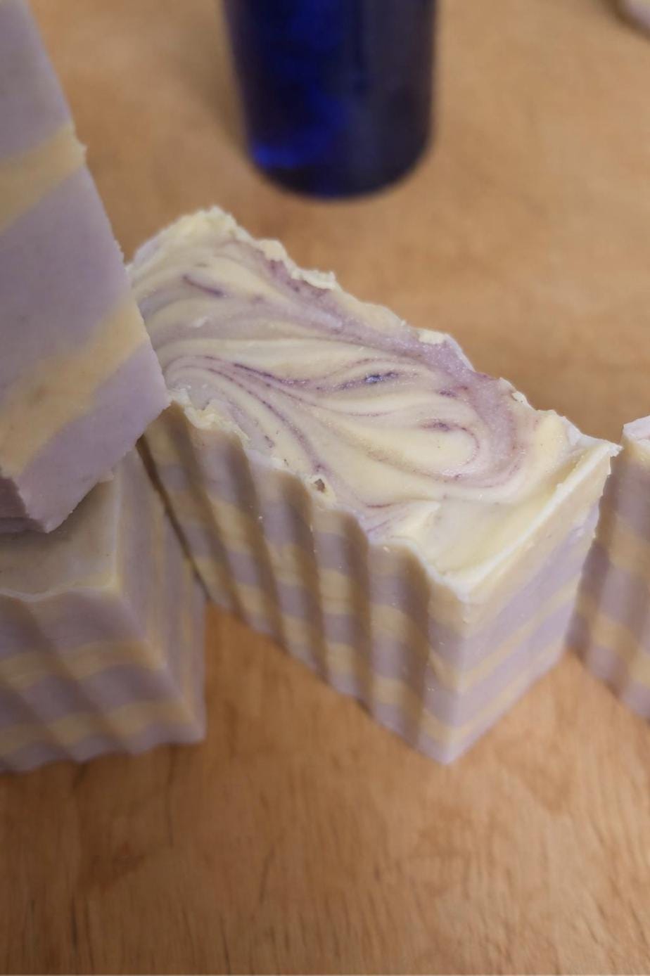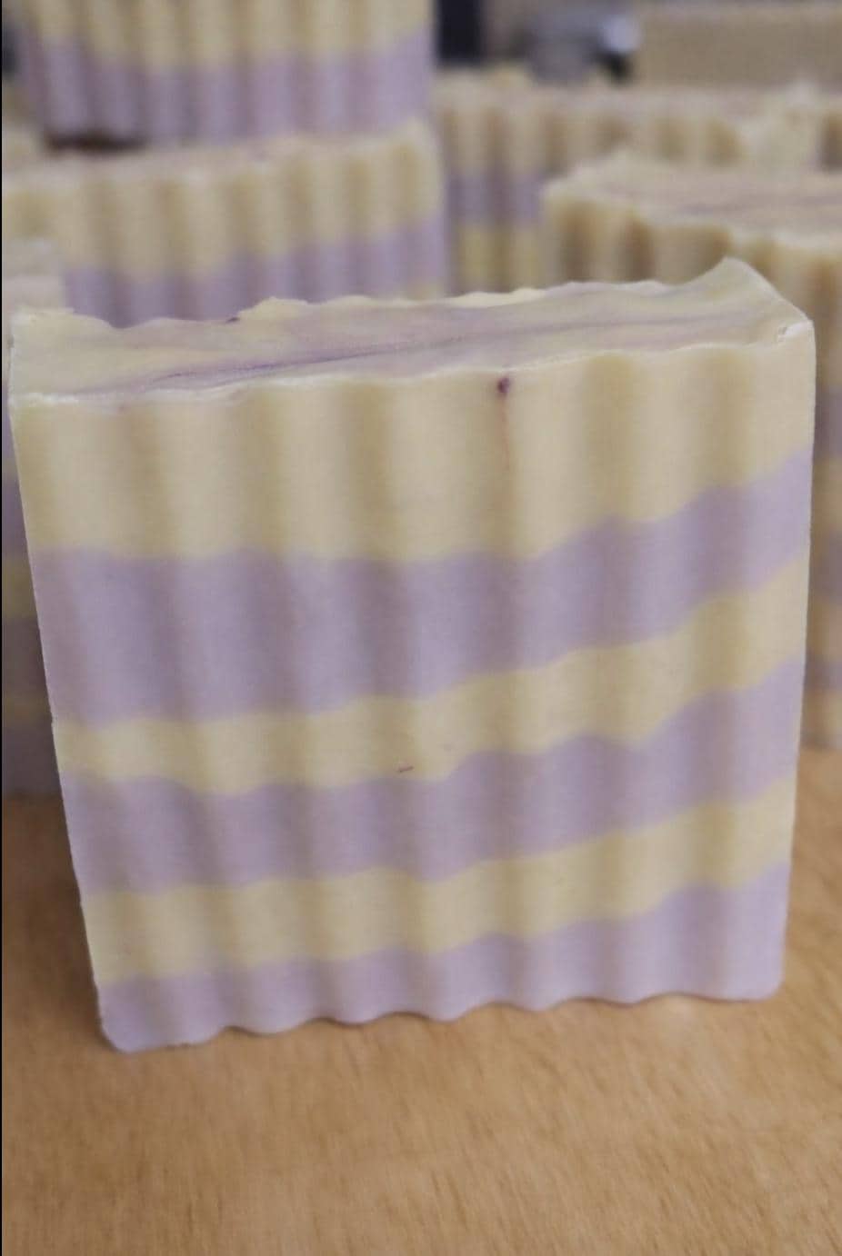 Each bar features soft lemon yellow and lilac layers with a delicate swirl top. Color and design will vary slightly, making every bar one-of-a-kind.